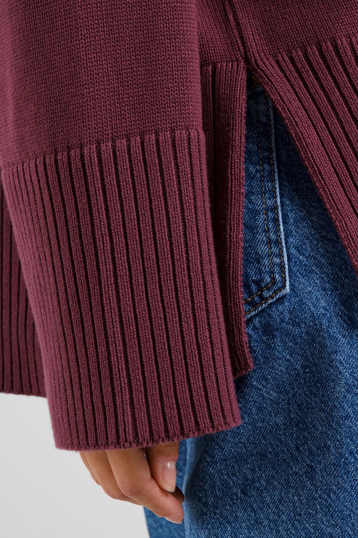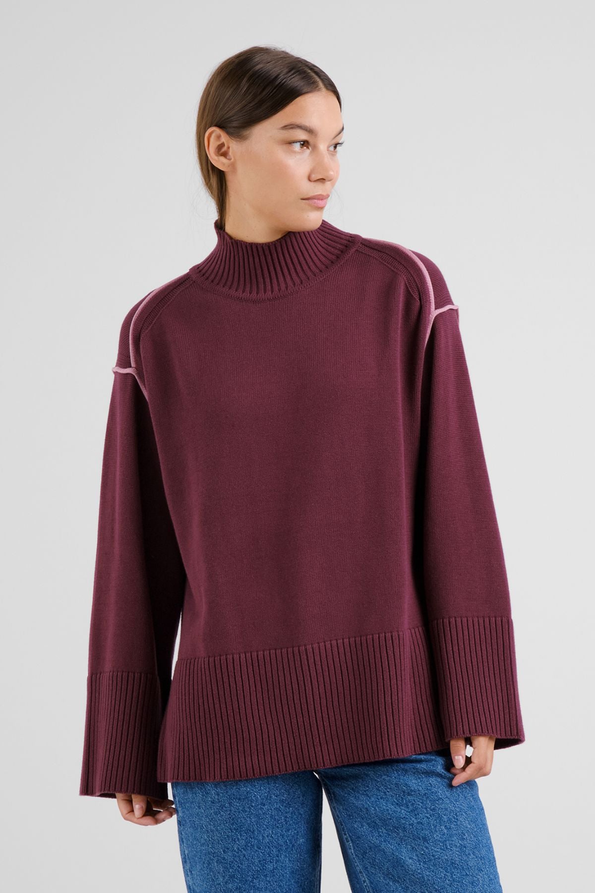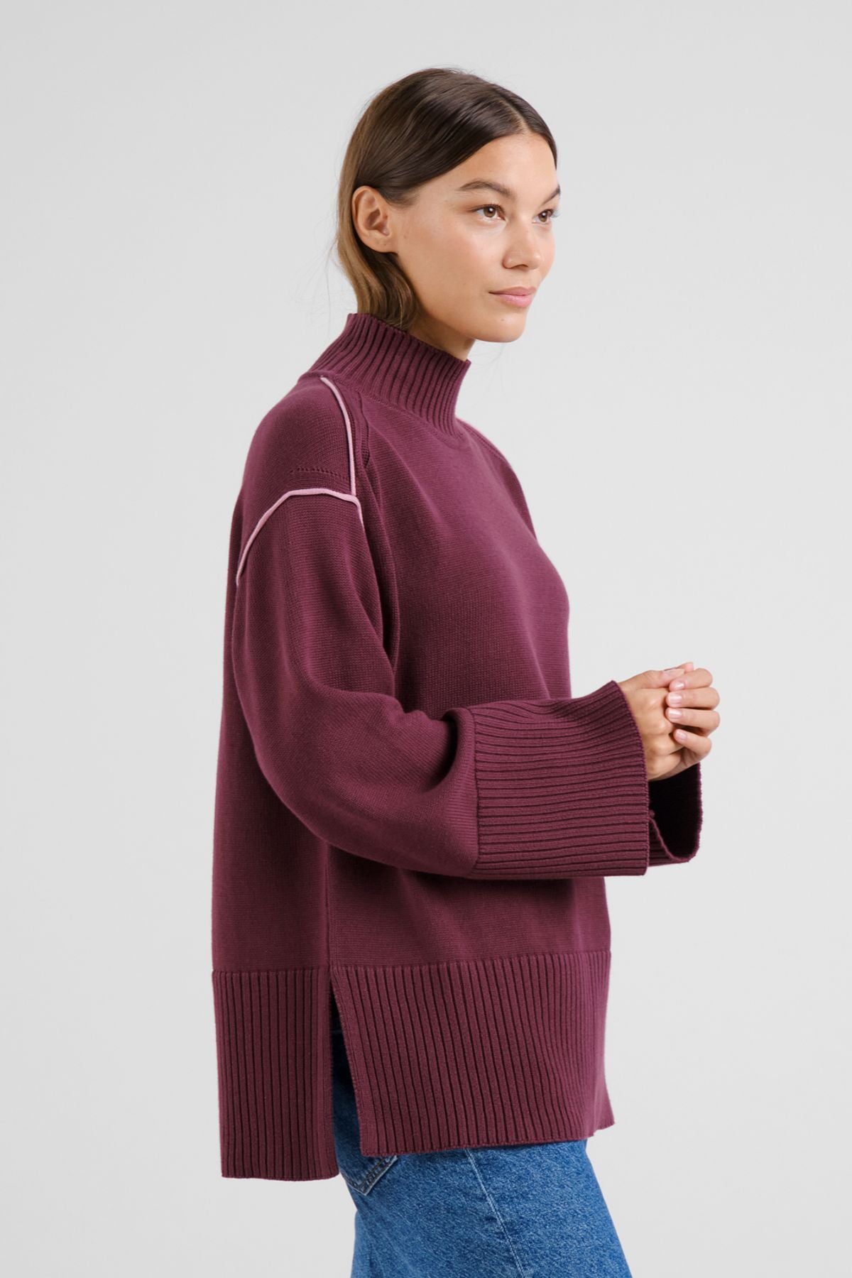 Women’s knitted sweater with a loose fit and high collar. Wide sleeves with contrast piping along sleeve opening. Wide 2x2 rib at collar, cuffs and bottom. Slit at bottom edge.