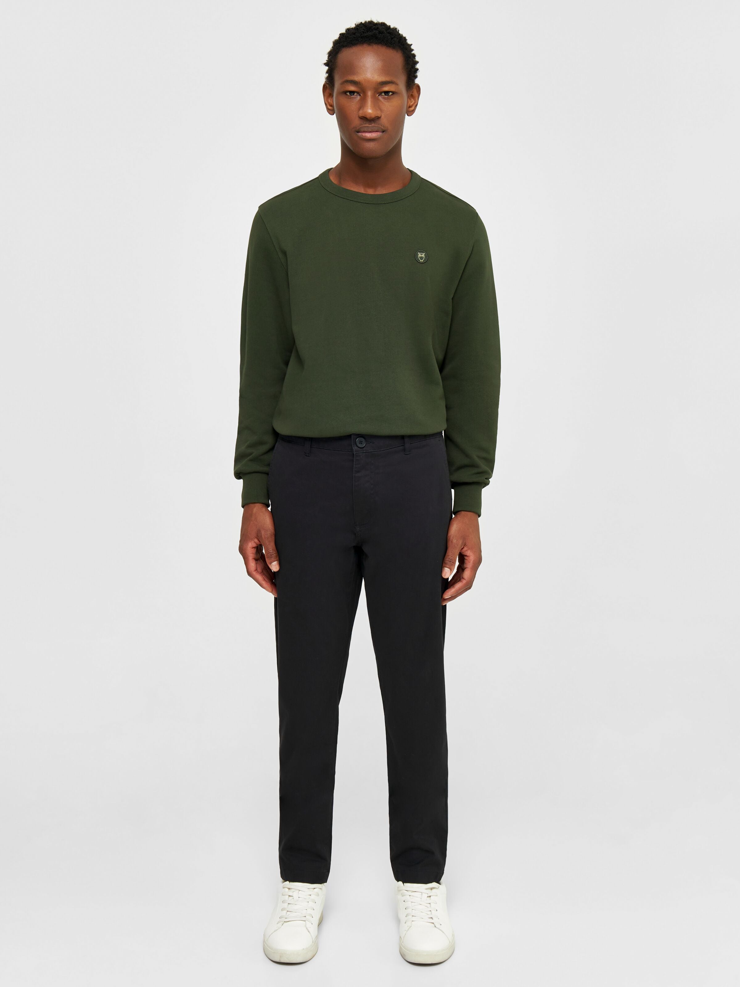 Dress up for your events with a pair of classic and timeless chinos. Made in a blend of organic cotton and a little bit of elastane, these chinos will stretch and adapt to your legs for everyday comfort. Designed in a slim, straight fit with slanted front pockets, discrete back pockets, button closure, and finished with belt straps.