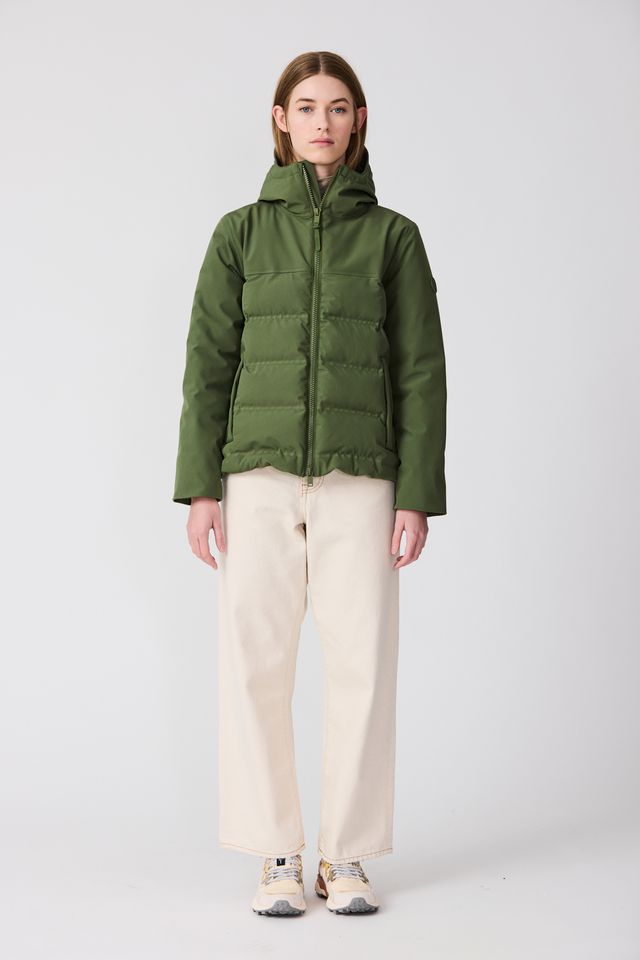Made from Tanta's signature waterproof Softshell fabric and padded with featherless, breathable insulation,Tempesta A-line short puffer offers comfort, lightness, and volume all at once. Fully seam-taped for superior waterproof protection, it features sleeves, hood, and upper front and back panels in plain fabric for contrast. A double-cursor waterproof front zipper completes the design, with all details finished in matching colors.