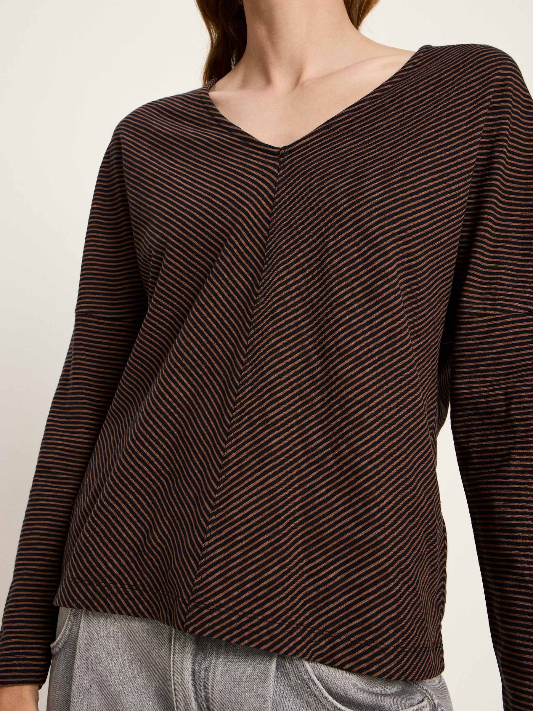 Simple with structure: This V-neck shirt made of GOTS-certified organic cotton combines a timeless design with exceptional material quality. The slightly textured slub jersey gives the soft cotton a vibrant surface and creates a natural, modern look. The feminine V-neckline visually lengthens the look, making the shirt a versatile styling partner.
